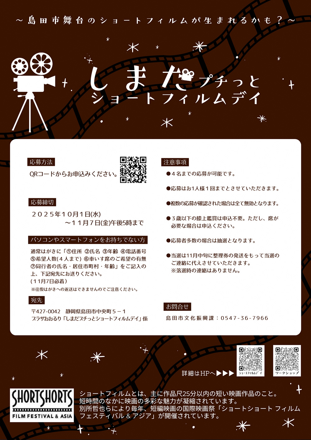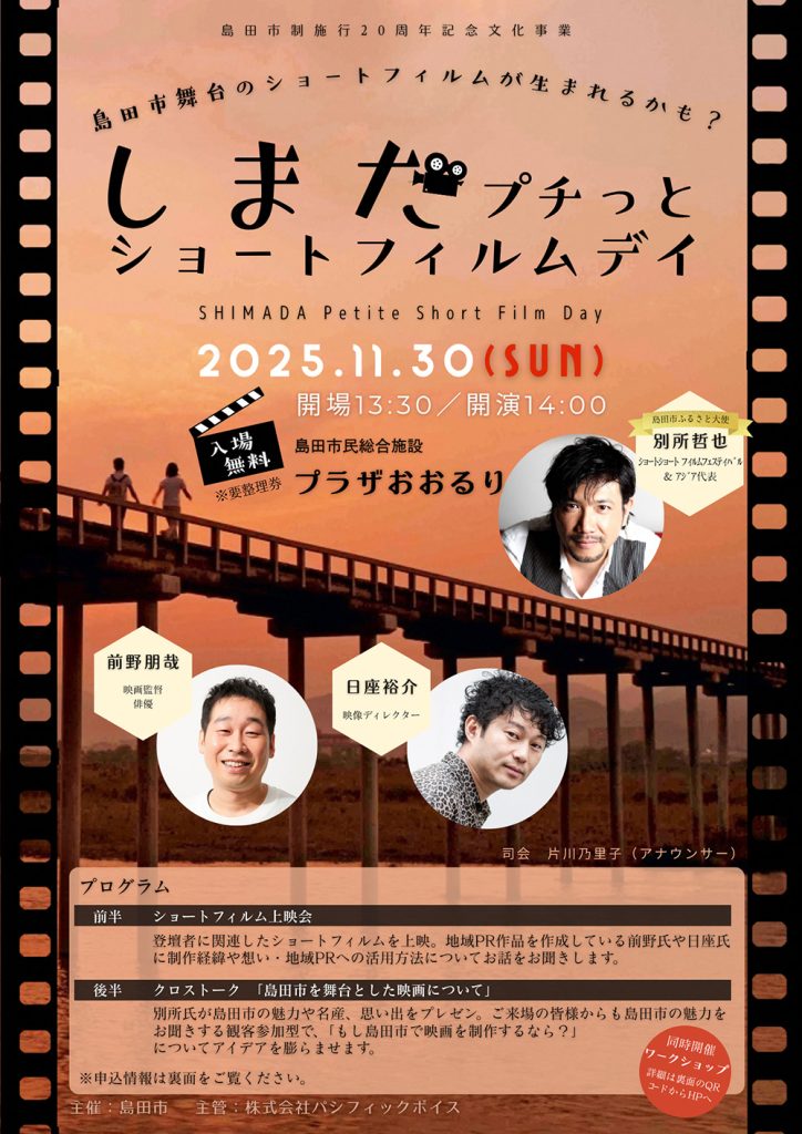しまだプチっとショートフィルムデイ 2025年10月23日 最終更新日時 : 2025年10月31日 sunada イベント開催日:2025年11月30日(日) POP掲出場所(おおるりホール入口) 島田市ふるさと大使の別所哲也さんらとともに、「島田市を舞台とした映画を制作するなら?」について一緒に企画を考えましょう。 イベントスタンプラリー参加イベント★イベントPOP設置場所おおるりホール入口実施エリア島田市実施会場島田市民総合施設プラザおおるり実施期間2025年11月30日(日)開場13:30 開演14:00実施主体主催:島田市 主管:(株)パシフィックボイス 詳しくはこちら FacebookXCopy