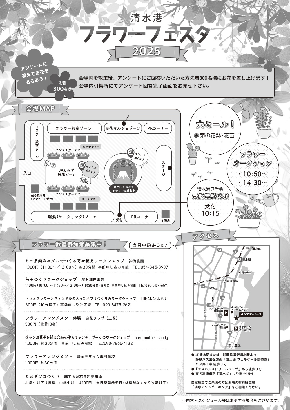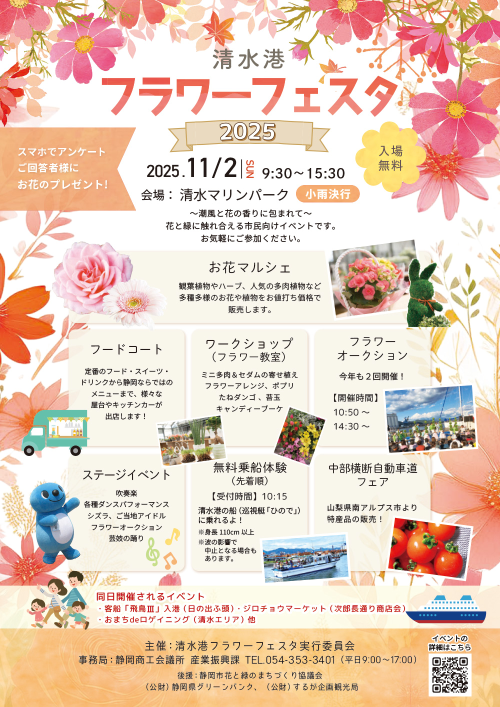 清水港フラワーフェスタ2025 2025年10月22日 最終更新日時 : 2025年10月31日 sunada イベント開催日:2025年11月2日(日) お花マルシェやフラワーオークションなど花と緑に触れ合える1日。ステージイベントや巡視艇乗船体験などイベント盛りだくさん! 実施エリア静岡市実施期間2025年11月2日(日)9:30~15:30 ※小雨決行実施会場清水マリンパーク実施主体清水港フラワーフェスタ実行委員会 詳しくはこちら FacebookXCopy