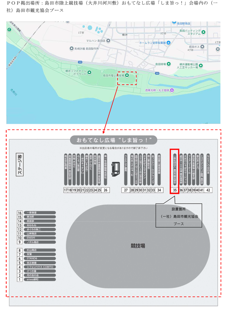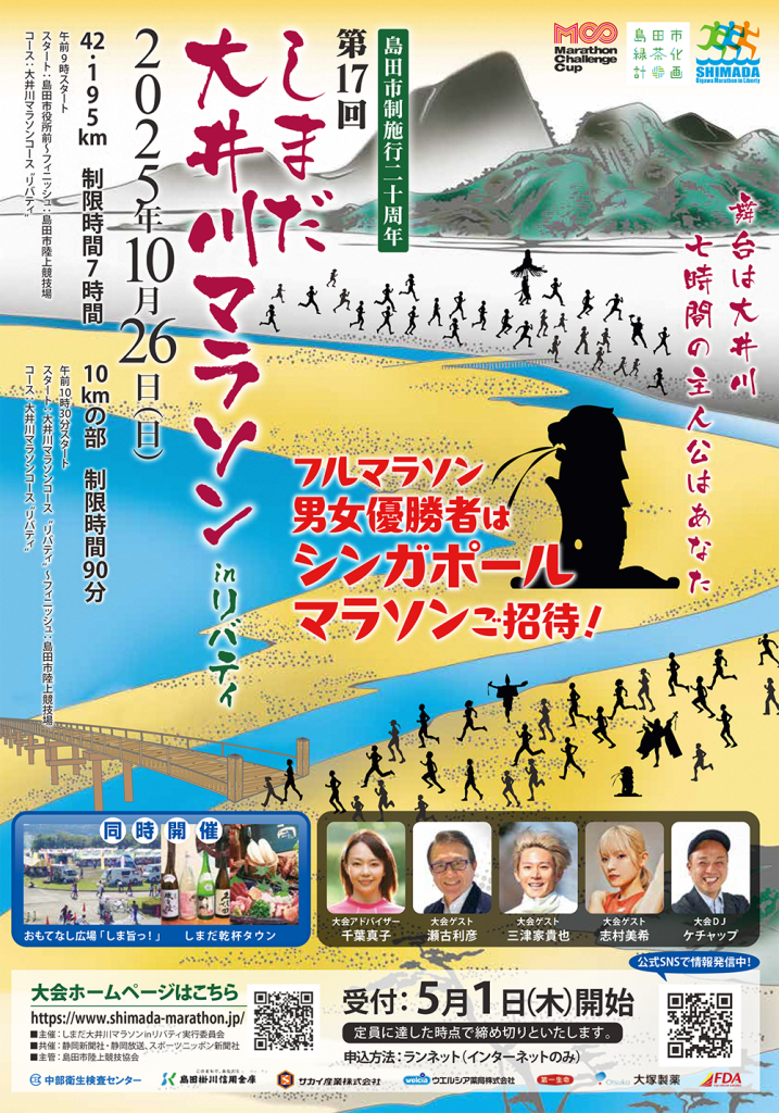 第17回 しまだ大井川マラソンinリバティ 2025年9月24日 最終更新日時 : 2025年9月30日 sunada イベント開催日:2025年10月26日(日) ゴール会場では多数の出店が並ぶ「しま旨っ!」やステージイベントを同時開催。地元・全国各地のおいしいものが勢ぞろい! イベントスタンプラリー参加イベント★イベントPOP設置場所島田市陸上競技場(大井川河川敷)おもてなし広場「しま旨っ!」会場内の(一社)島田市観光協会ブース実施エリア島田市実施会場島田市街地島田市陸上競技場ほか実施期間2025年10月18日(土)実施主体しまだ大井川マラソンinリバティ実行委員会 詳しくはこちら FacebookXCopy