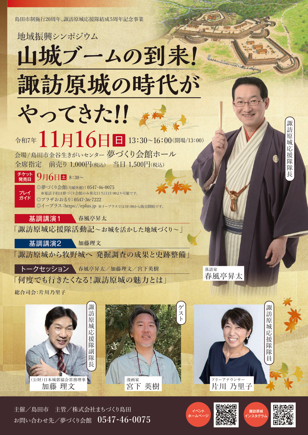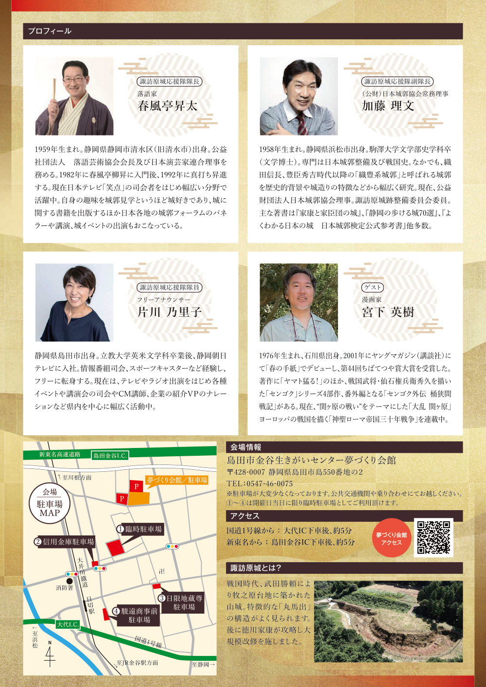 諏訪原城応援隊結成5周年記念イベント 2025年10月23日 最終更新日時 : 2025年10月31日 sunada イベント開催日:2025年11月16日(日) 山城ブームの到来!諏訪原城の時代がやってきた!!をテーマに漫画家の宮下英樹さんをゲストに迎え諏訪原城跡の魅力に迫ります。 イベントスタンプラリー参加イベント★イベントPOP設置場所島田市金谷生きがいセンター 夢づくり会館2階ホール入り口実施エリア島田市実施会場島田市金谷生きがいセンター 夢づくり会館ホール実施期間2025年11月16日(日)13:30~16:00( 開場13:00 )実施主体島田市観光文化部博物館課 詳しくはこちら FacebookXCopy